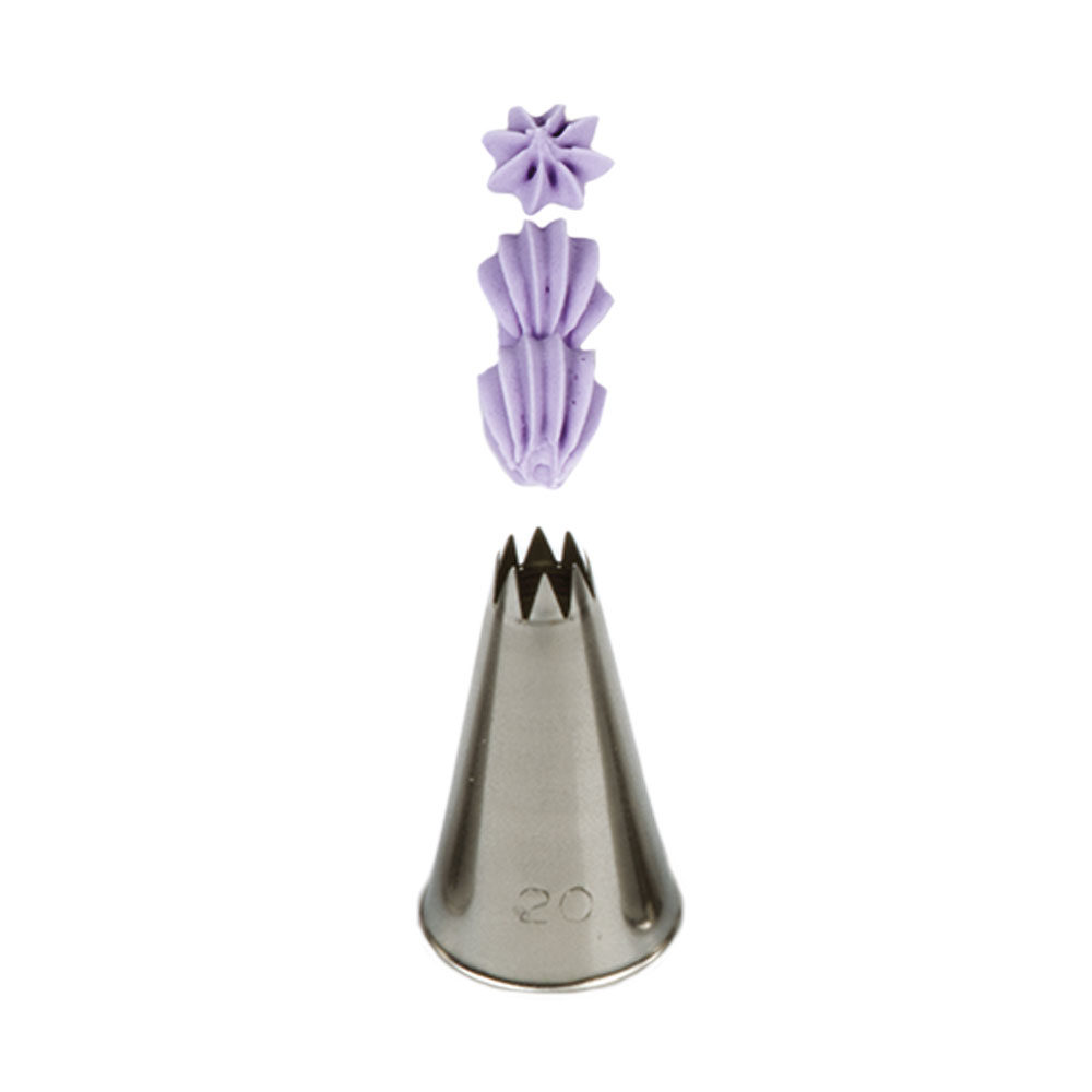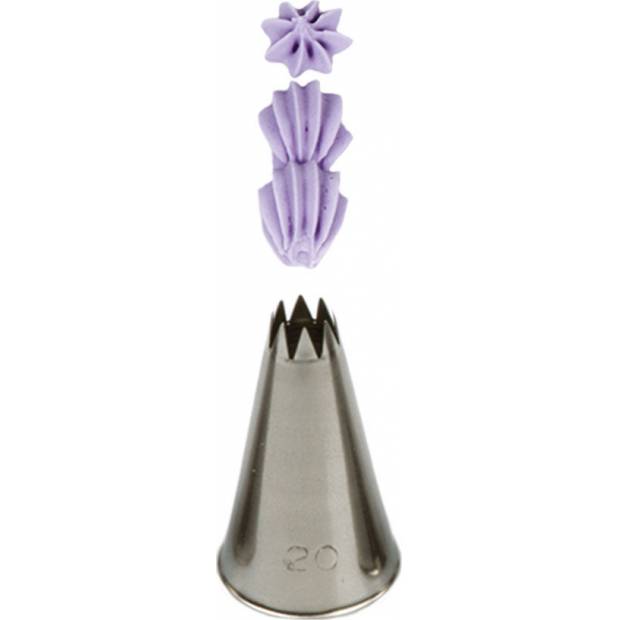 Metallischer Tortenspitzenaufsatz, geschnitten 20, der eine genaue und einzigartige Verzierung garantiert. Die Spitze kann wiederholt mit einer Spritztüte verwendet werden. Sie besteht aus Edelstahl, Fettflecken hinterlassen keine Spuren auf der Oberfläche. Für die Spülmaschine nicht geeignet.