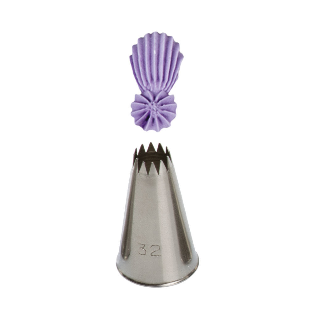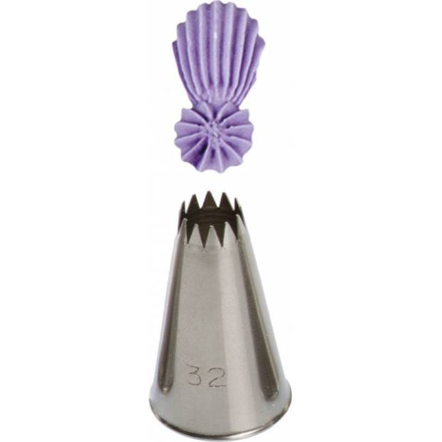 Metall-Pâtisserie-Tüllenspitze, geschnitten 32, mit der Sie garantiert sehr präzelle und einzigartige Dekorationen erstellen. Die Spitze können Sie wiederholt mit einer Spritztüte verwenden. Sie besteht aus Edelstahl, die Oberfläche bleibt frei von Fettflecken. Nicht spülmaschinenfest.