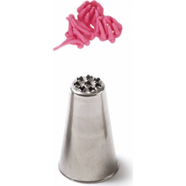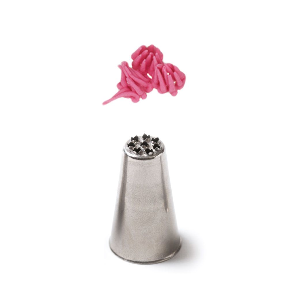 Metallische Backspitzen-Verzierungs-Tip 234 garantieren eine präzise und einzigartige Verzierung. Die Spitze kann wiederholt mit einer Spritzbeutel verwendet werden. Sie besteht aus Edelstahl, Fettflecken bleiben auf der Oberfläche nicht zurück. Nicht geeignet für die Spülmaschine.