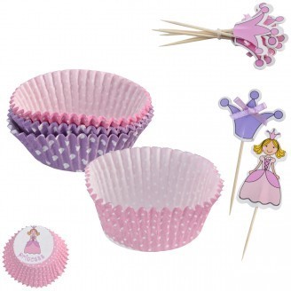 Papiermuffins mit Prinzessinnenaufdruck und dekorative Holzzahnstocher - ideales Set für Kinderparty, Geburtstagsparty, Urlaub etc. Die Körbchen eignen sich für Muffins, Cupcakes und andere verschiedene Süßigkeiten, die Zahnstocher z.B. für Obstsnacks. Die