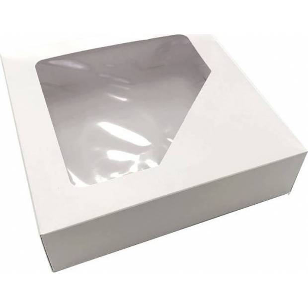 Weiße Kuchenschachtel mit Fenster. Diese Schachteln eignen sich für Kuchen, Makronen und Teegebäck. Größe: 22 x 22 x 6 cm.