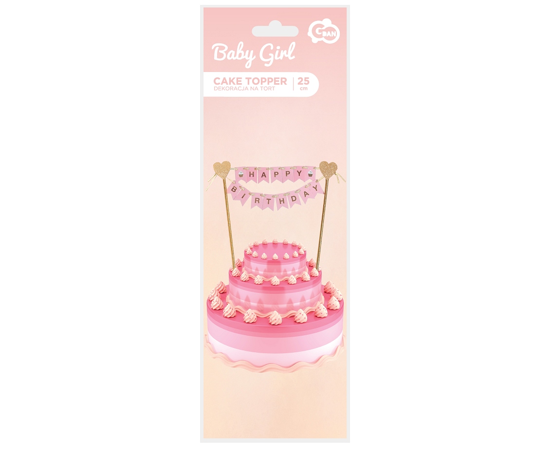 Dekoration für die Torte. Bunte, pastellfarbene Stab-/Deko mit den Worten alles Gute zum Geburtstag. Der Stab in Form einer farbigen Girlande, die zwischen goldenen Röhren hängt. Abmessungen: Höhe ca. 25 cm.