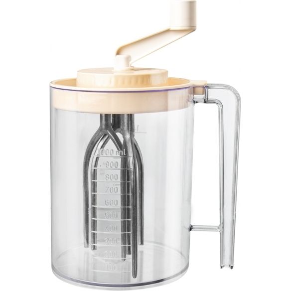 Handrührgerät für die Küche hilft Ihnen beim Aufschlagen von Sahne, Eiweiß zu Schnee, dünnflüssigen Teig für Kuchen... Sie können auch das Gefäß mit Henkel und Messbecher verwenden. Material: Kunststoff, Quirl aus eloxiertem Aluminium. Leichte Pflege. Nicht spülmaschinengeeignet. Maße: Volumen - Messbecher 1 l, Gesamtes Gefäßvolumen 1,5 l, Ø 11,5 cm, H 22 cm.