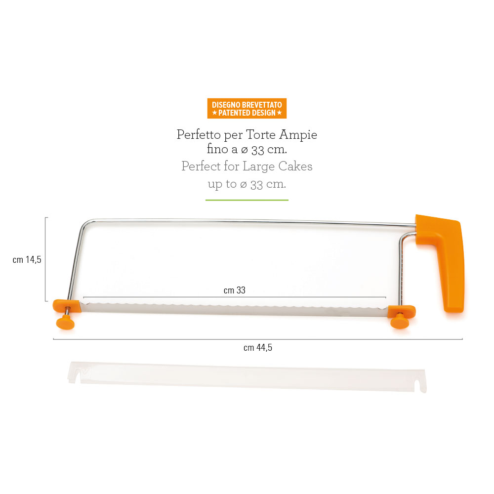 Mit diesem Kuchenmesser zum Kuchen schneiden Sie Kuchen mit einer Breite von bis zu 30 cm. Klar beschriftete Höheninformationen helfen Ihnen, den Kuchen genau zu schneiden. Flache Kunststofffüße sorgen für besondere Stabilität. Das Messer ist spülmaschinenfest. Die Klinge ist 32 cm breit.