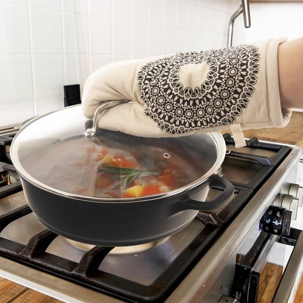 Küchenhandschuh mit bunten Motiven ist mit einer Silikonhandfläche ausgestattet.