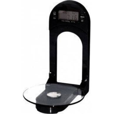 Hängende Digitalwaage, die von einer runden Glasschale begleitet wird, auf der die gewogenen Köstlichkeiten platziert werden. Die maximale Belastung der Waage beträgt 3Kg. Neben dem aktuellen Gewicht wird auch die Zeit angezeigt. Das Produkt verfügt über Funktionalitäten wie Stoppuhr oder Timer. Die Wandwaage hat einen klappbaren Arm und wird mit Bleistiftbatterien betrieben.