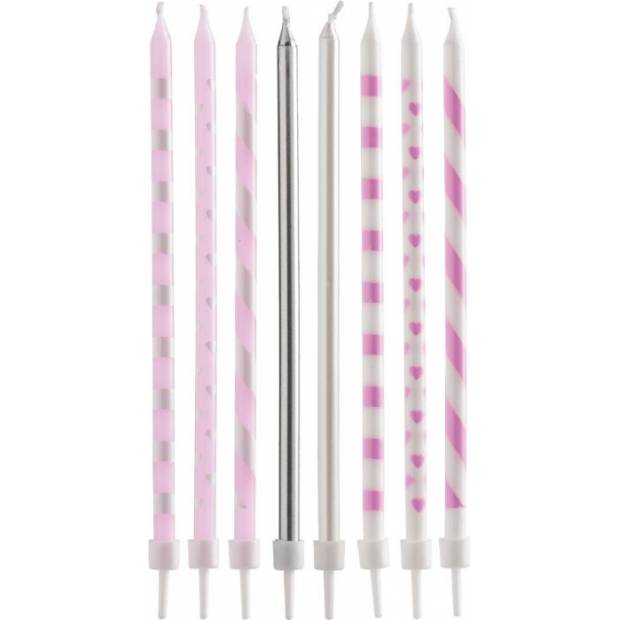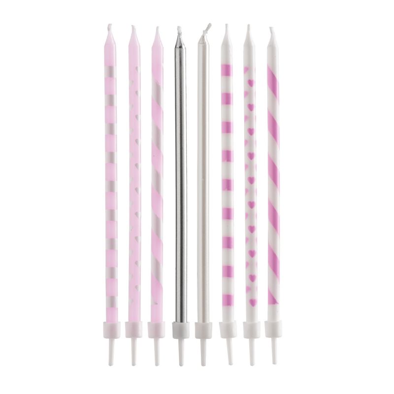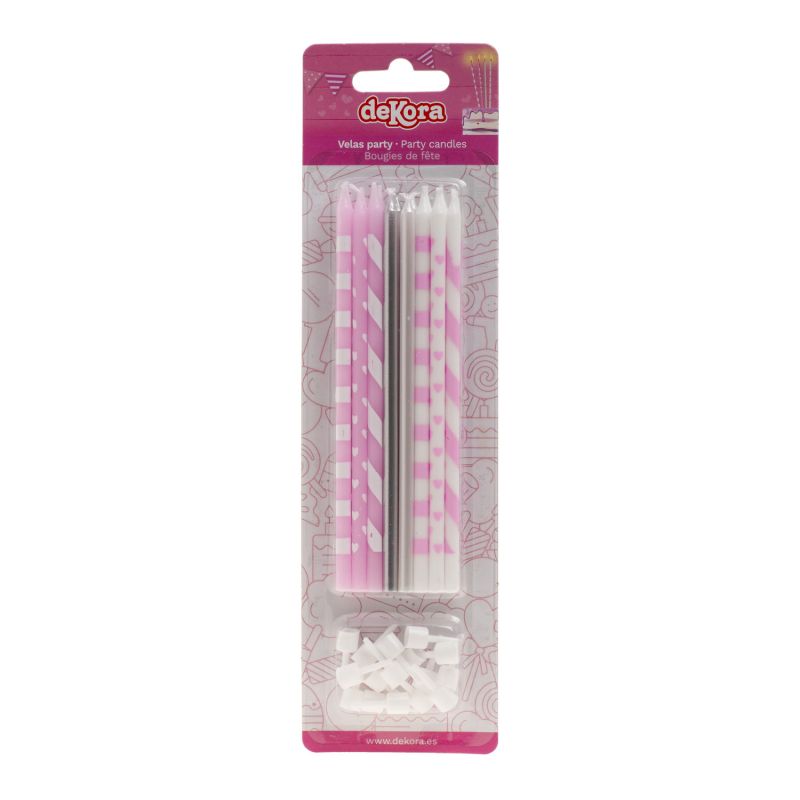 Rosa, weiße und silberne Kerzen, ideal zum Dekorieren von Geburtstagskuchen. Die Verpackung enthält 16 Kerzen und 16 Halter. Die Kerzenhöhe beträgt 13 cm.