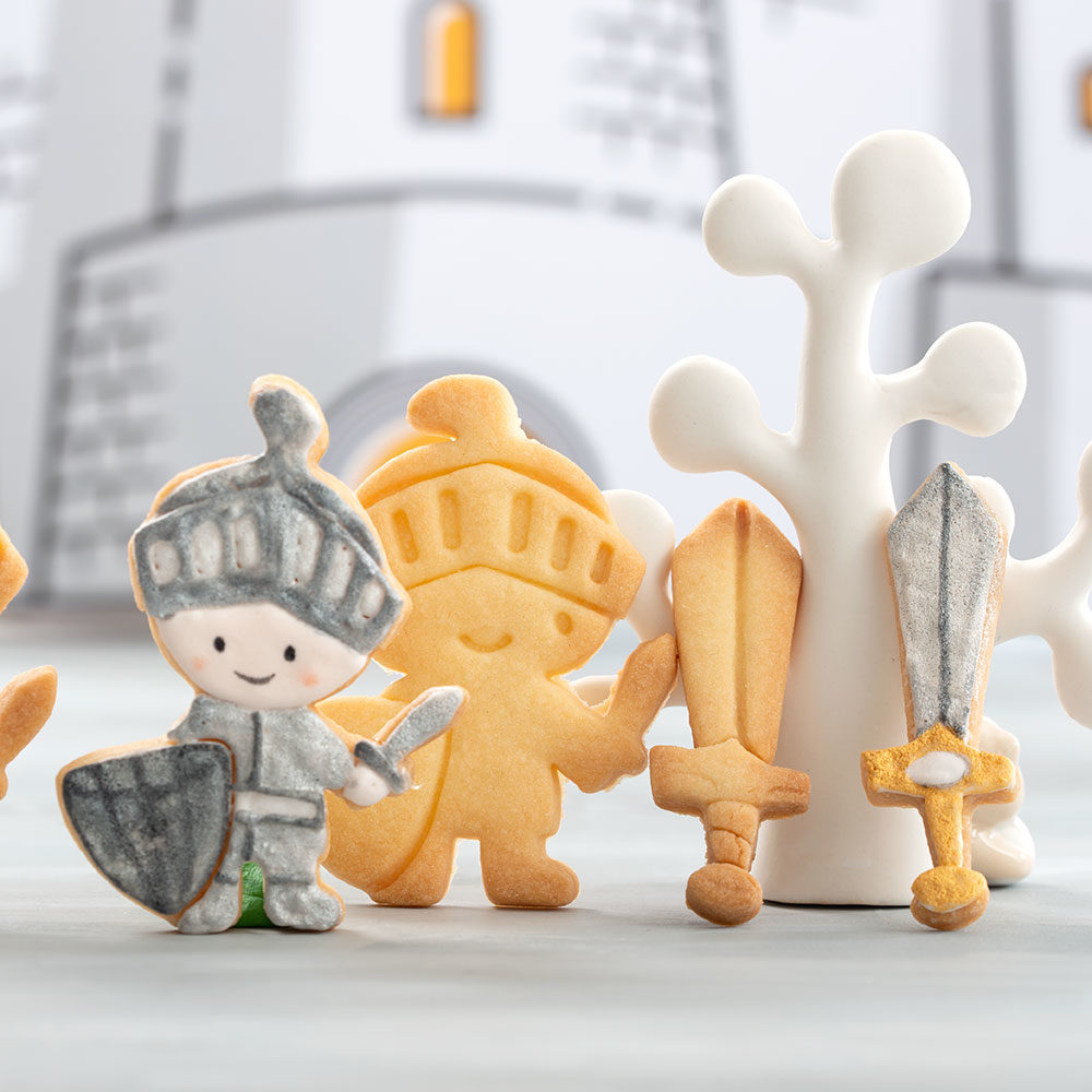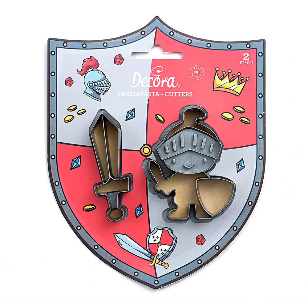 Set aus zwei Kunststoff-Ausstechformen mit Motiven eines Ritters und eines Schwerts. Weihnachts-Ausstechformen für Plätzchen sind aus gesundheitlich unbedenklichem und leicht zu reinigendem Kunststoff hergestellt. Geeignet für alle Arten von süßen und salzigen Teigen, für Marzipan- und Glanzmasse usw. Abmessungen: Ritter 6,5 x 8,5 x 2,2 cm - Schwert 2,5 x 8 x 2,2 cm.