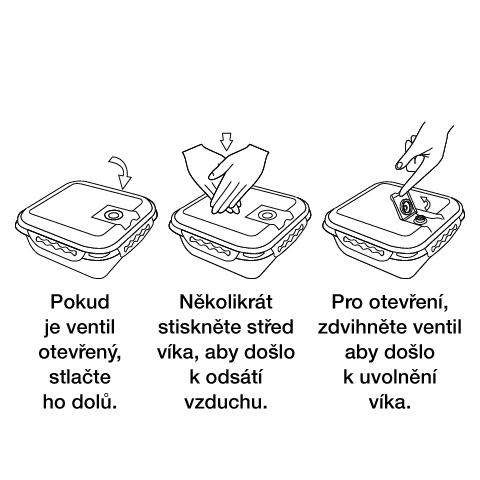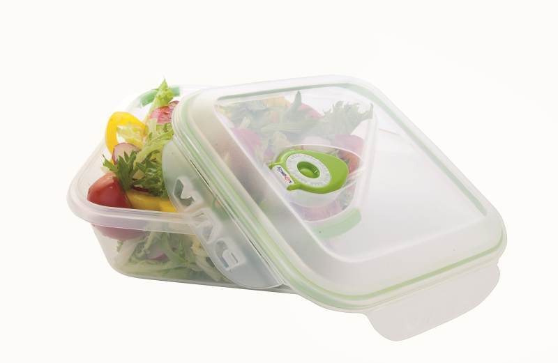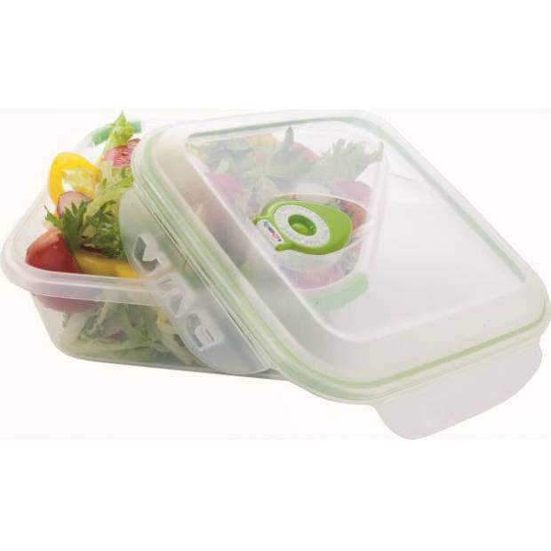 Praktische Vorratsdose zum Aufbewahren und Transportieren von Lebensmitteln. Befestigen Sie den Deckel mit den Seitenclips, schließen Sie das Ventil und drücken Sie die Dose, um die Luft auszuwerfen. Im Vakuum oxidieren die Lebensmittel nicht und bleiben zwei- bis dreimal länger frisch. Ideal zur Aufbewahrung von Obst, Gemüse, Käse, Schinken und weiteren Lebensmitteln, die schnell verderben oder austrocknen. Die Dose kann im Kühlschrank und Gefrierschrank aufbewahrt werden und kann in der Mikrowelle (ohne Deckel) erhitzt werden. Die Dose besteht aus festem Kunststoff.