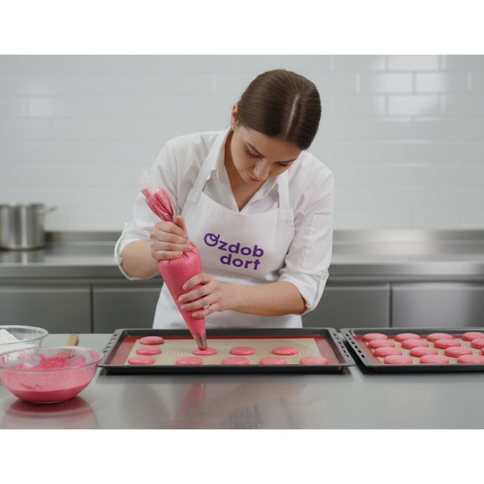 Die Verwendung der Mischung ist sehr einfach und zeitersparend. Es reicht, 1000 g Macaronmix mit 200 g Wasser zu mischen, 5 Minuten auf Stufe 2 zu schlagen und mithilfe eines Saftsacks auf das Silikonbrett zu spritzen. Nach kurzer Antrocknung können die Makronen bei 140–150 °C gebacken werden und innerhalb von 25 Minuten erhält man bis zu 120 perfekt gleichmäßige Stücke (ca. 10 g Teig pro Makrone). Das Ergebnis ist stets ein professionelles Aussehen und Geschmack, den Kunden und Gäste schätzen werden.