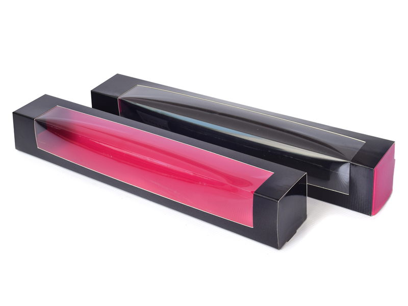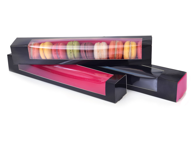 Zweifarbige Macarons-Box in schwarz-pinken Ausführung. Dort passen 6-9 Makronen hinein, sie wird in zwei Teilen geliefert. Abmessungen 315x47x47mm mm.