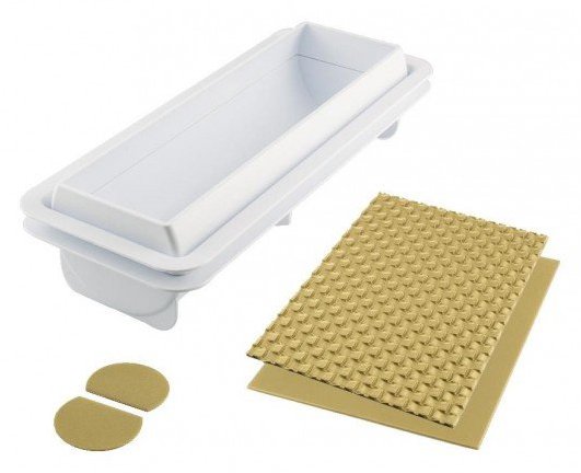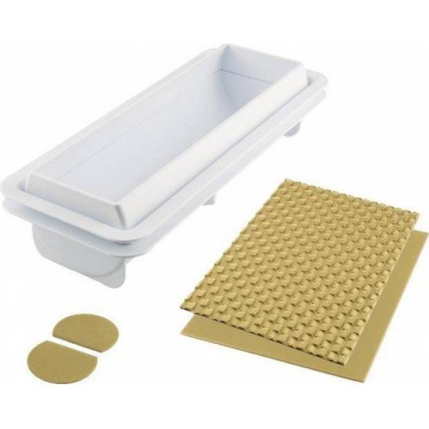 Das Set enthält eine zweiteilige Kunststoffform und vier verschiedene Silikonpads zum Auskleiden der Formen (zwei Endpads, ein einfaches Pad und ein Pad mit Flechtmuster). In der Verpackung finden Sie auch das Originalrezept für die Zubereitung des Semifreddo. Abmessungen des Innenteils: Länge: 25,7 cm, Breite: 8 cm, Tiefe: 7 cm.