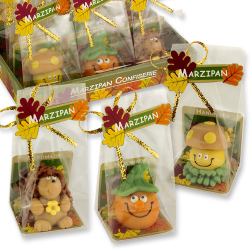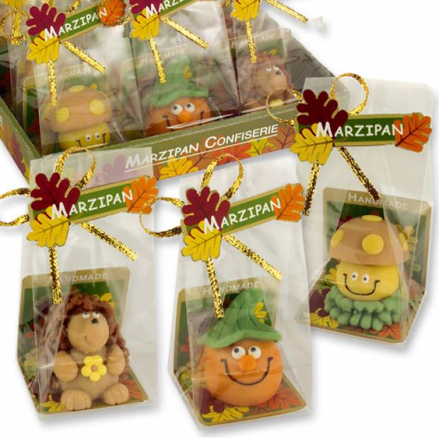 Die Marzipanfiguren sind als Herbstmotive gestaltet. Diese essbare Dekoration ist ein schönes Geschenk für Ihre Liebsten. Mehrere Motive zur Auswahl, jede Figur ist in einem Zellophanbeutel verpackt. Abmessungen 38 x 40 x 45 mm ( 32g).