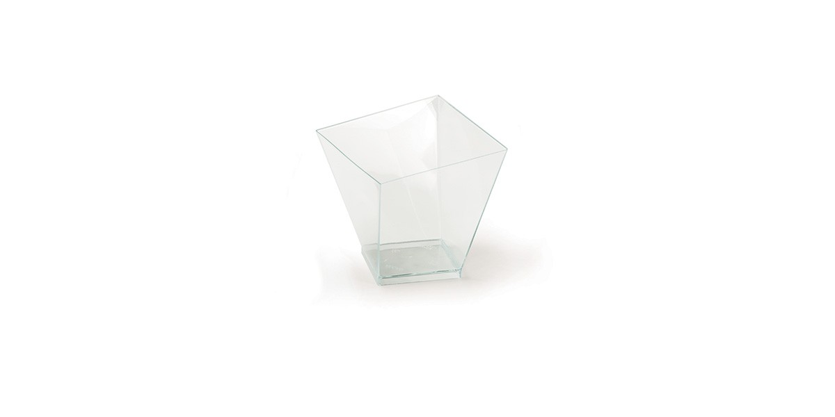 Quadratisches Glas hat geneigte Seiten und aufgrund des Produktionsmaterials (PS), das an Glas erinnert, reflektiert das Licht dort interessant und erzeugt farbige Reflexe. Das Glas hält maximal 40°C. Nicht heiße Speisen darin servieren. Maße: 7,2 x 7,2 x 7,9 cm.