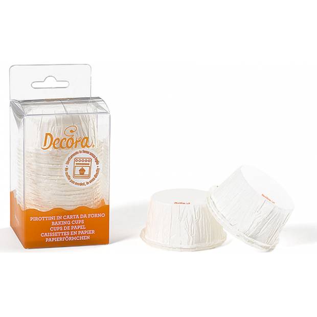 Papiertörtchenförmis für Muffins in weißer Farbe. Für jeden salzigen und süßen Teig, der beim Backen gut aufgeht. Die Förmchen stehen von selbst, man benötigt kein spezielles Backblech.