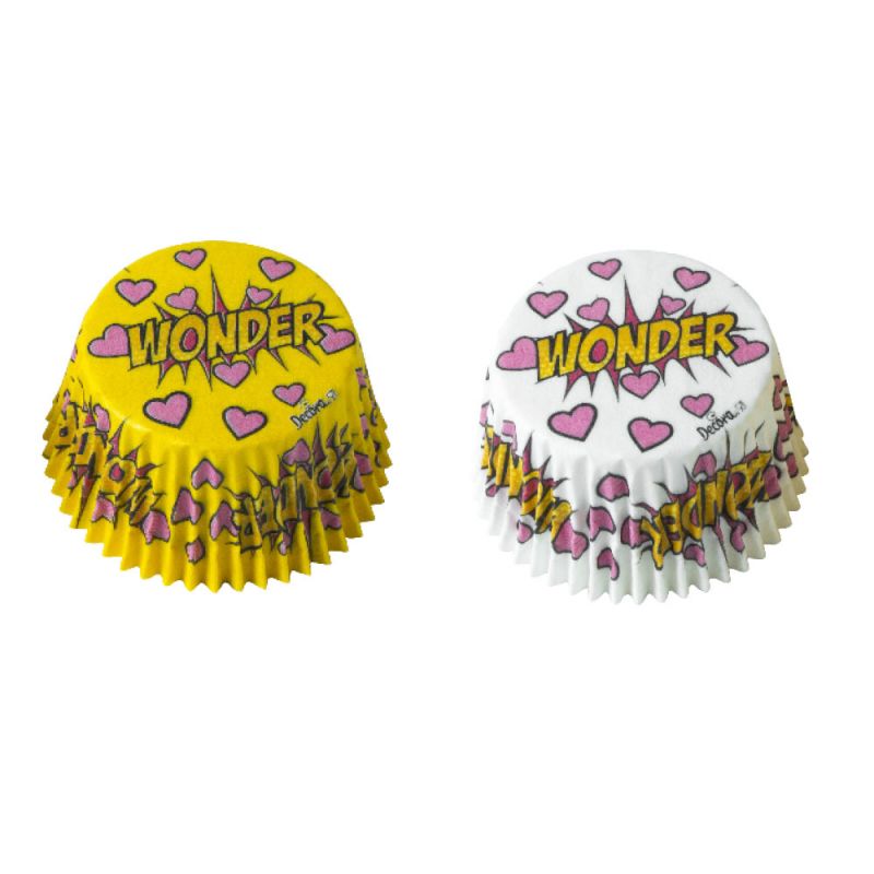 Weiße und gelbe Muffinförmchen mit Wonder-Aufdruck und Herzchen für Cupcakes von Decora. Einweg-Muffinförmchen aus Backpapier mit Durchmesser 5 cm. Made in Italy-Qualität, hervorragend für Liebhaber hausgemachter Snacks, Backwaren und Tortendesign. Runde Backpapier-Muffinförmchen mit gewellten Rändern, weißer oder gelber Untergrund mit Wonder-Aufdruck und Herzchen, hergestellt aus lebensmittelechtem, hitzebeständig bis +220°C. Hergestellt aus hochwertigen professionellen Materialien, lebensmittelkontaktgeeignet zertifiziert. Abmessungen: Durchmesser ca. 5 cm, Höhe 3,2 cm. Verpackung 36 Stück Einweg-Backförmchen aus Backpapier