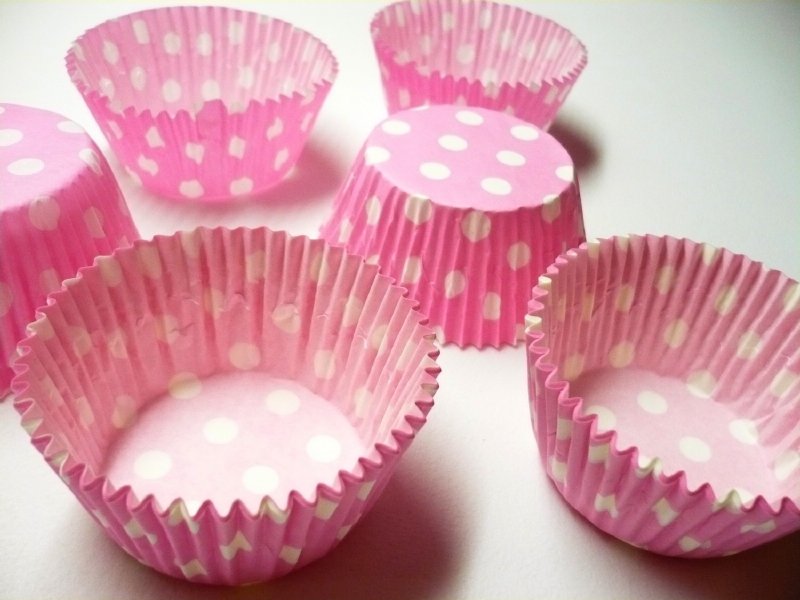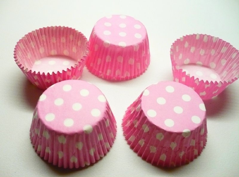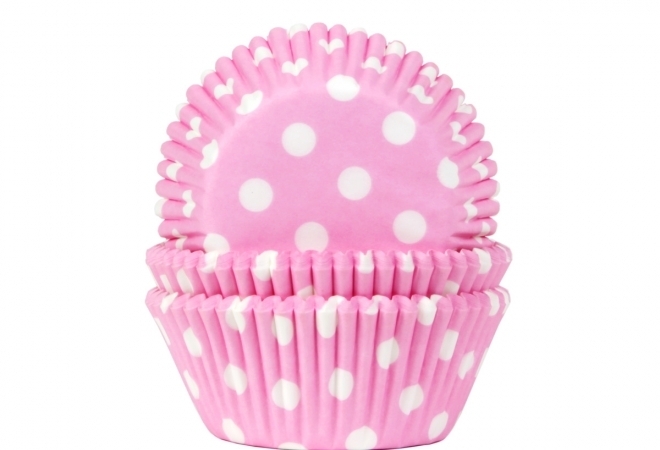 Satz aus fünfundsiebzig Pergamentbackformen für das Backen und Servieren von ungezuckertem Gebäck. Die Förmchen sind rosa mit weißem Punk dot Muster.