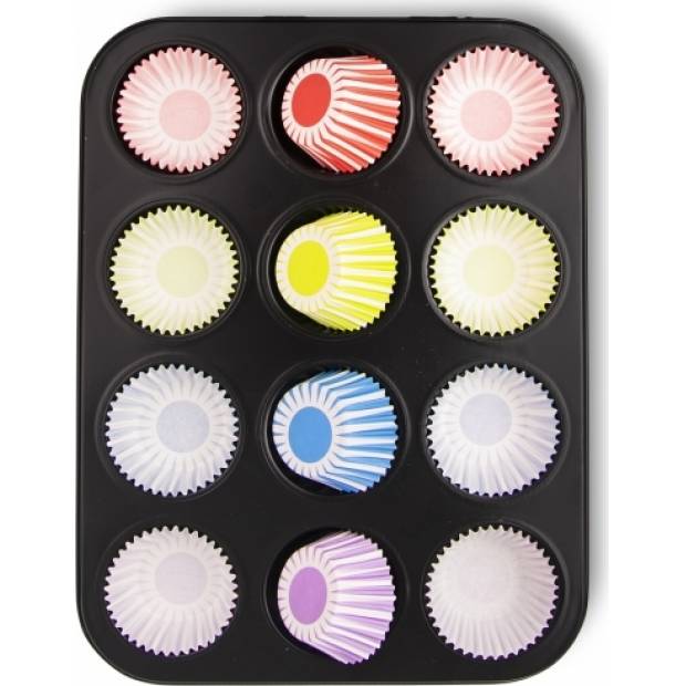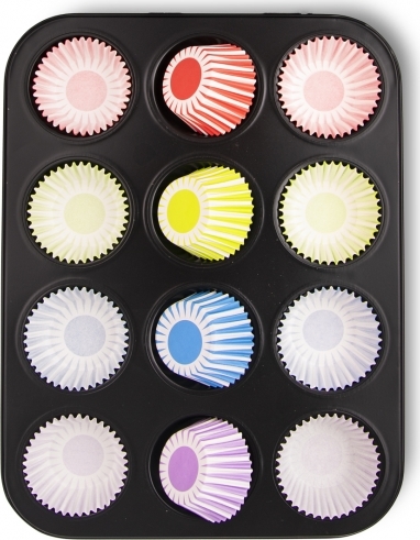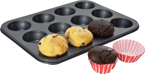 Eine praktische Form mit antihaftbeschichtetem Boden können Sie entweder direkt verwenden oder mit eingefügten Backpapierförmchen, in denen Muffins, Cupcakes, süße und herzhafte Tartelettes direkt serviert werden.