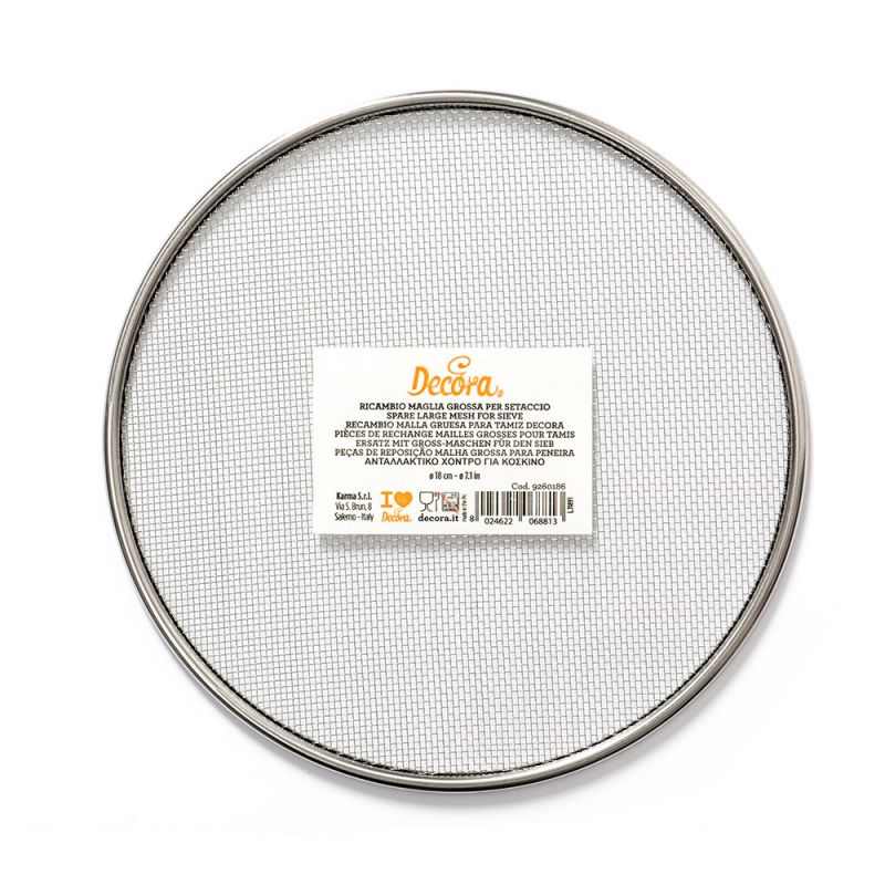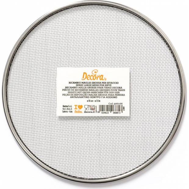 Náhradní síťka pro kulaté síto Decora s hrubou ocelovou síťovinou. Je vhodné k prosévání mouky, kakaa, smetanových sýrů, prášků obecně a k získání ovocného pyré. Sítový kotouč je zakončen silným ocelovým okrajem a síťovina je celá z oceli. K výměně kruhu stačí jednoduchý tlak na okraj síta. Náhrada za kulaté síto užitečné pro prosévání moučkového cukru, mouky, prášků a kakaa, ale také smetanových sýrů, ovocných pyré a mnoha dalších potravin. Vyrobeno z certifikovaných materiálů pro styk s potravinami. Rozměry: průměr ?18 cm. Jemná síťovina má texturu přibližně 0,5 mm. Ruční mytí.