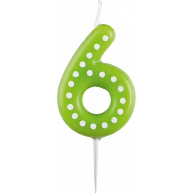 Geburtstagskerze in Form der Zahl 6 mit Punkten. Höhe 6,5 cm.