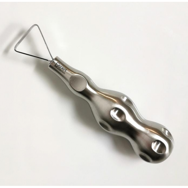 Spezialmesser zum Schneiden von Schokoladendekorationen aus dem Schokoladenblock. Das Messer kann verwendet werden, um das Material bei der Herstellung von größeren Dekorationen oder Figuren abzuschneiden. Bei der Arbeit können Sie den größeren Teil abschneiden und dann nur die Details glätten, zum Beispiel mit einem Kugelknochen.
