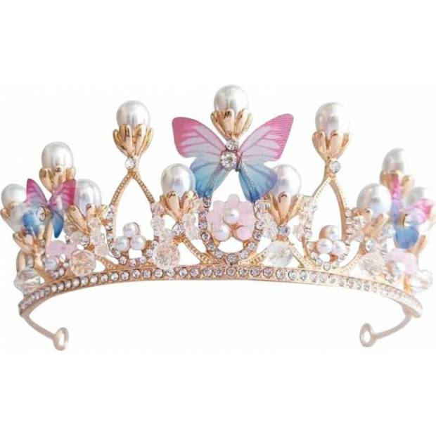 Ungeziehbare Verzierung Metall Krone Gold mit Perlen und Schmetterlingen