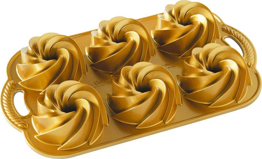 Dieses elegante spiralförmige Design für Mini-Gugelhupfe eignet sich für jeden Anlass. Mini-Gugelhupfe können Sie mit Zucker bestreuen oder mit einer einfachen Glasur überziehen. Die Form besteht aus gegossenem Aluminium, das feine Details und hervorragende Backeigenschaften bietet. Der markante antihaftbeschichtete Innenraum erleichtert die Verwendung der Backform. Der robuste Behälter aus gegossenem Aluminium verteilt Wärme schnell und gleichmäßig, um gleichmäßiges Backen zu unterstützen und eine delikate goldene Kruste zu ergeben. Nicht spülmaschinengeeignet.