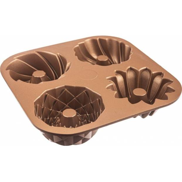 Designform für die Zubereitung von vier kleineren Gugelhupfkuchen, Muffins, Pudding, Sülze und Füllung mit einem Durchmesser von 10 cm, in luxuriösem Design und kupferfarben. Die Form ist nicht nur praktisch, sondern auch beeindruckend. Außerdem ist sie eine schöne Dekoration in modernen und rustikalen Küchen.