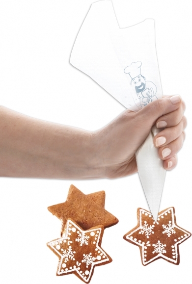 Backbeutel zum Dekorieren von Plätzchen und anderen süßen oder pikanten Leckereien. Von Ihnen selbst durch Abtrennen der Spitze können Sie eine so breite Öffnung für das Dekorieren mit Creme oder Aufstrich schaffen, wie Sie benötigen.