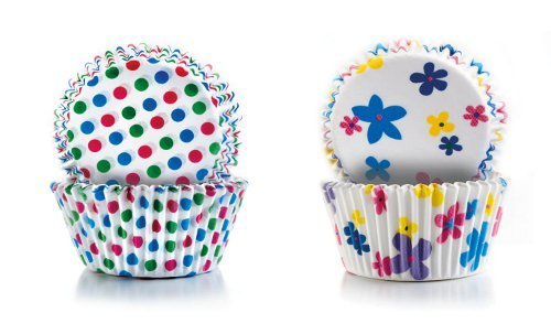 Kuchenkappen für Backwaren in wirtschaftlich sehr vorteilhaftem 2 x 50 Stück Pack – farbige Blüten- und Pünktchen-Dekoration. Das Papier lässt Fett nicht durch, sie können auch für Muffins verwendet werden.