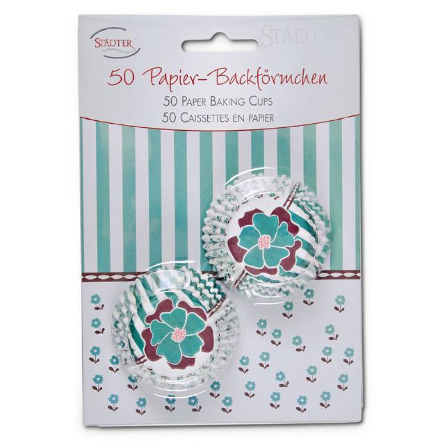 "Papier-Mini-Backförmchen - Körbchen mit türkisfarbenen Blüten und Streifen. Papierförmchen eignen sich zum Backen von Muffins und Cupcakes. Füllen Sie die Förmchen beim Backen immer nur zu 2/3 mit Teig, der Teig vergrößert während des Backens sein Volumen.