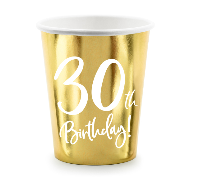 Papierbecher in metallischem Gold mit weißer Aufschrift für den 30. Geburtstag fassen etwa 220 ml. Papierbecher ersparen Ihnen Mühe, Sie müssen kein Geschirr spülen. Gebrauchte Becher einfach in den entsprechenden Behälter für sortierbaren Abfall werfen.