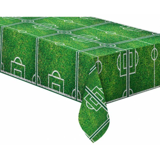 Plastik-Tafeldecke mit dem Motiv eines Fußballplatzes ist eine interessante Dekoration für alle Kinderfeste. Abmessungen 180 x 120 cm.