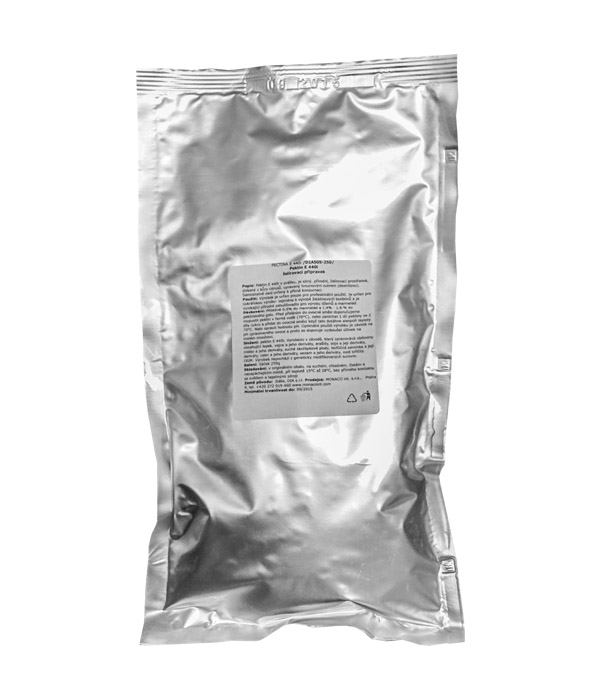 Pektin E440i ist ein sehr starkes Geliermittel natürlichen Ursprungs. Es wird aus der Schale von Zitrusfrüchten gewonnen und mit Traubenzucker verarbeitet. Nicht zum direkten Verzehr bestimmt. Dieses Produkt wird ausschließlich professionell in der Zuckerindustrie zur Zubereitung von Marmeladen, Gelbonbons verwendet. Dosierung: ca. 0,5% in Marmeladen und 1,4% - 1,6% in Gelee mit Pektin. Vor dem Hinzufügen zur Obstmischung ist es sinnvoll, Pektin zuerst in heißem Wasser (70°C) aufzulösen, oder 1 Teil Pektin mit 2 Teilen Zucker zu mischen und der Obstmischung zuzusetzen, die mindestens 70°C erreicht. Danach ist der pH-Wert zu korrigieren. Die optimale Verwendung des Produkts hängt von dem pH des verarbeiteten Obsts ab, daher wird empfohlen, die Wirkung zunächst in kleiner Menge zu testen.