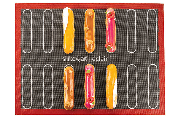 Durch die Öffnungen wird Wärme gleichmäßig über die Oberfläche der Unterlage verteilt und sorgt für eine perfekte Durchbackung sowohl an der Oberseite als auch am Boden. Mikroperforierte Silikonunterlagen können auch als Stützen beim Einfrieren verwendet werden; sie sind rutschfest und antihaftend. Auf der Unterlage sind vorgezeichnete Formen für die Herstellung von Éclairs oder Choux, traditionellen französischen Desserts.