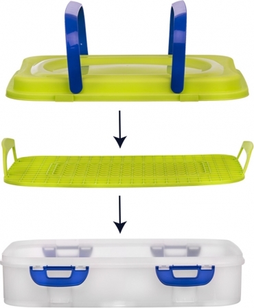 Die Ausstattung umfasst ein Plastikgitter mit Griffen, die das Entnehmen des Inhalts erleichtern, und einen Plastikdeckel mit zwei Griffen, die ein bequemes Tragen der Box ermöglichen.