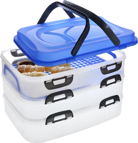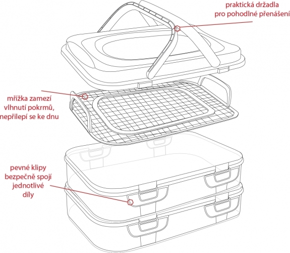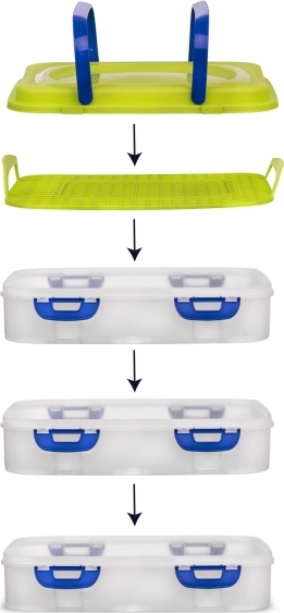 Sie hat drei eigenständige Ebenen, die miteinander durch mehrere Clips befestigt werden. Das Set enthält ein Plastikgitter mit Griffen, das das Herausnehmen des Inhalts erleichtert. Außerdem gehört eine Plastikabdeckung mit zwei Griffen dazu, die das bequeme Tragen der Box ermöglicht.