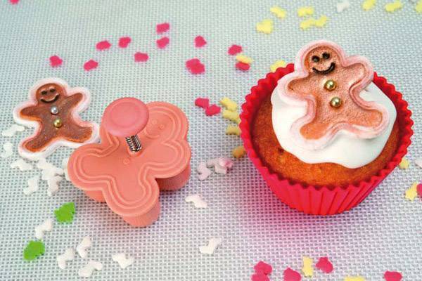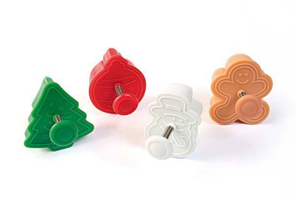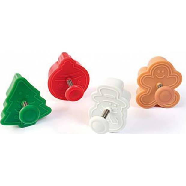 Diese farbenfrohen Ausstechformen werden Ihre Weihnachtsvorbereitungen verschönern. Die Ausstechformen haben die Motive von Herrn Lebkuchen, Weihnachtskugel, Baum und Schneemann. Gleichzeitig mit dem Ausstechen der gewünschten Form wird auch ein dekoratives Muster auf den Teig gedruckt. An jeder Ausstechform befindet sich ein federbelasteter Auswerfer, mit dem Sie den Teig leicht ausstechen können.