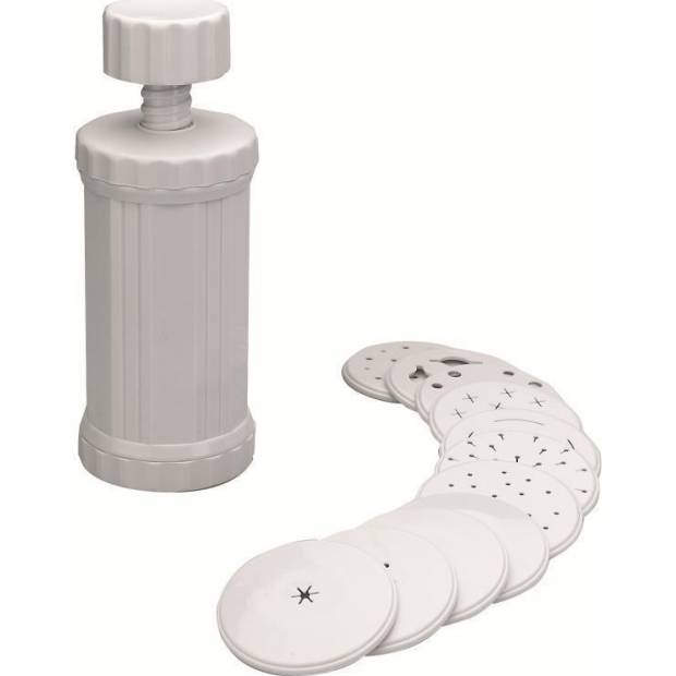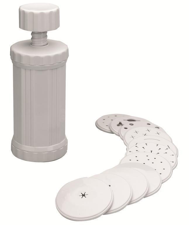 Příprava těstovin, pečiva a nejrůznějšího cukroví nyní nabývá na zcela jiné podobě. Tvořte své výsledné pochutiny za přispění mnoha šablon, jež se postarají o originální vzhled výsledného pokrmu. Výrobek je zhotoven z kvalitního plastu. Princip fungování je velice snadný – stroj pracuje za pomoci tlaku a vytlačování dané ingredience.