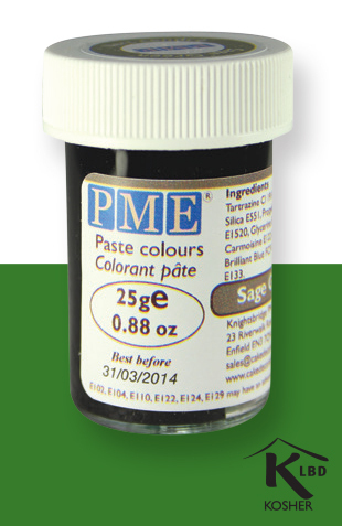 Grüngraue Gelierfarbe färbt Lebensmittelmasse leicht. Einfach anzuwenden, auch für weniger erfahrene Konditoren. In der Packung 25 g Gelierfarbe.