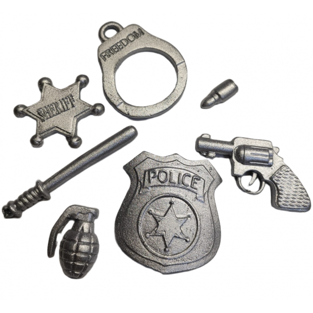 Polizei-Set ist perfekte Dekoration für alle kleinen (und großen) Fans von Actionhelden, Polizisten und Abenteuergeschichten. Jedes Teil – vom Abzeichen bis zur Pistole, Handschellen oder Trillerpfeife – ist von Hand modelliert mit enormer Präzision, dank derer die Figuren fast schon realistisch wirken. Feine Details, genaue Formen und klare Linien machen aus diesem Set eine Dekoration, die eine gewöhnliche Torte in eine atemberaubende Feier verwandelt.