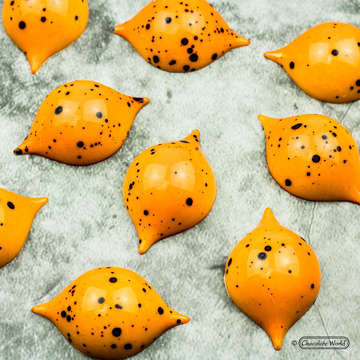 Polycarbonatform für die Herstellung perfekter Schokoladenpralinen. Diese hochwertige europäische Form ist einfach zu verwenden, Ihre Schokolade wird eine glänzende und glatte Oberfläche haben und sich leicht lösen lassen. Um bunte Schokoladenstücke zu erhalten, tragen Sie eine dünne Schicht farbigen Kakaobutter auf die Form auf, bevor Sie sie mit Schokolade füllen. Das Design dieser Form ermöglicht es, perfekte Formen mit glatt bearbeiteten Linien zu gestalten.