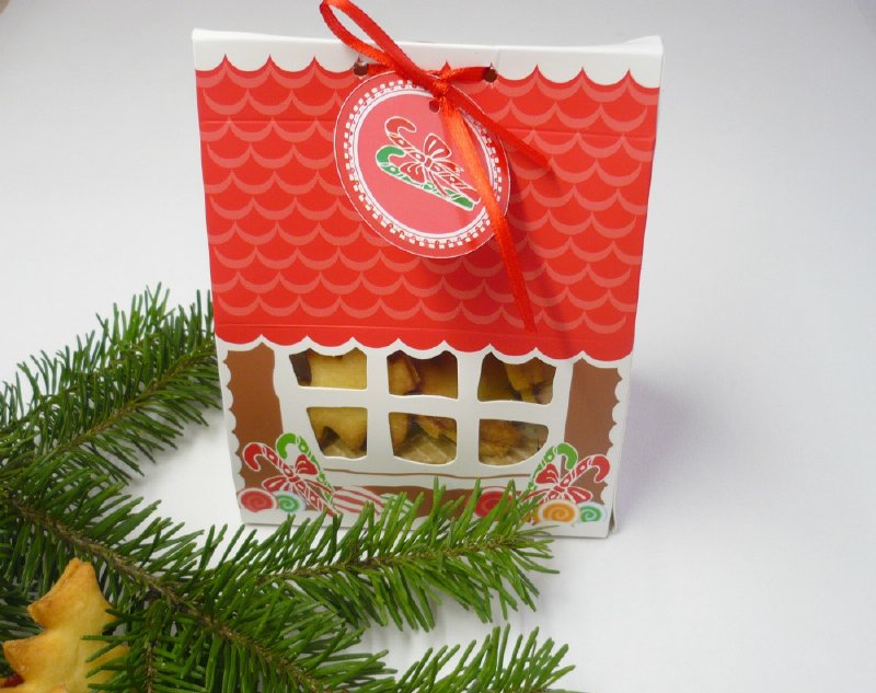 Die Original-Verpackung für Plätzchen in dem Stil eines Lebkuchenhäuschchens ist perfekt für feine Plätzchen, mit denen Sie Ihre Lieben erfreuen. Die Box ist rot-braun und mit Weihnachtsmotiven verziert. Sie ist mit einer Schleife und einer Namenskarte versehen.