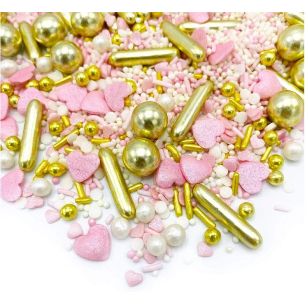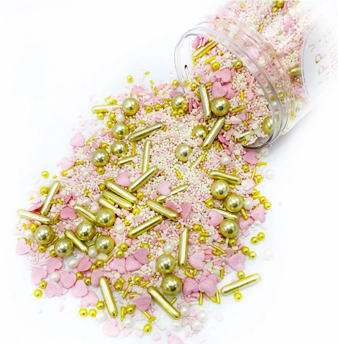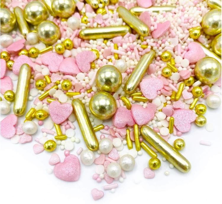 Wahrscheinlich eine unserer elegantesten Streuselmischungen – Tagebuch der Prinzessin! Wunderschöne rosa Bonbonherzen, elegante goldene Stäbchen und Schokoladenperlen – ein Märchen erfüllt. Diese Streuselmischung verzaubert sofort jedes Gebäck – ob Cupcake, Kuchen oder Donut. Probier es aus!
