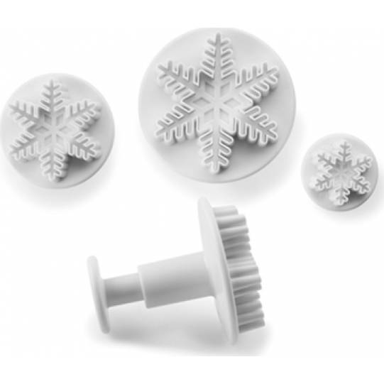 Mit dem Ausstecher prägen Sie ein Muster auf den Zuckerteig und schneiden gleichzeitig eine perfekte Schneeflocke aus dem Teig aus. Durch das Kolbenpressen lassen sich der Teig und der Ausstecher leicht herauslösen. Der größte Ausstecher im Set hat einen Durchmesser von 5,5 cm, die beiden anderen Schneeflocken 4 cm bzw. 2,5 cm. Material: Plastik.