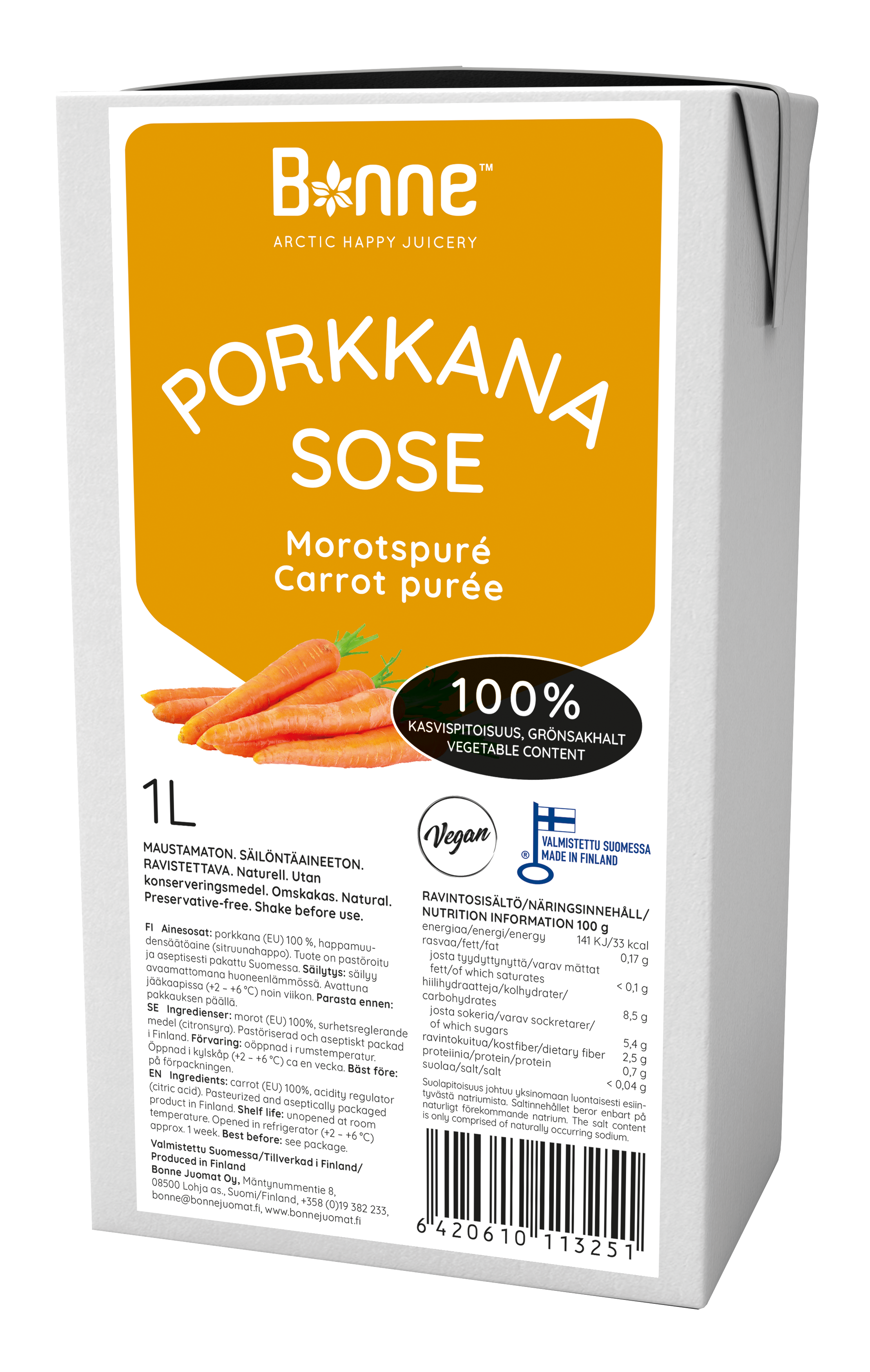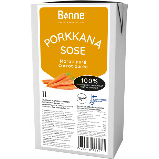 Karotte ist eine beliebte und nahrhafte Wurzelgemüse, die voller grundlegender Vitamine, Mineralien und Antioxidantien ist, wie Vitamin A, C und K. Sie sind in verschiedenen Farben erhältlich, darunter Orange, Lila und Weiß, von denen jede einzigartige gesundheitliche Vorteile bietet. Karotten sind auch vielseitiges Gemüse, das Sie roh, gekocht oder zu Saft oder Smoothie gemischt genießen können. Eine der wichtigsten gesundheitlichen Vorteile von Karotten ist ihr hoher Gehalt an Beta-Carotin. Beta-Carotin ist eine Art Carotinoide, die im Körper in Vitamin A umgewandelt wird, das für gesundes Sehvermögen, Immunfunktion und Hautgesundheit unerlässlich ist. Karotten sind außerdem eine großartige Quelle für Ballaststoffe, die die Verdauungsgesundheit verbessern und Sättigungsgefühle unterstützen können. Darüber hinaus können Antioxidantien in Karotten dazu beitragen, Zellen vor Schäden durch freie Radikale zu schützen, die zum Altern und zu Krankheiten beitragen können. Dank ihrer süßen, knackigen Struktur sind Karotten eine schmackhafte und nahrhafte Ergänzung zu jeder Mahlzeit oder jedem Snack. Bonne Carrot Puree ist unbehandeltes, ungesüßtes, 100% Püree aus Wurzelgemüse ohne Zusatzstoffe und Konservierungsstoffe. Es eignet sich für vielseitige Kochauswendungen. Zutaten