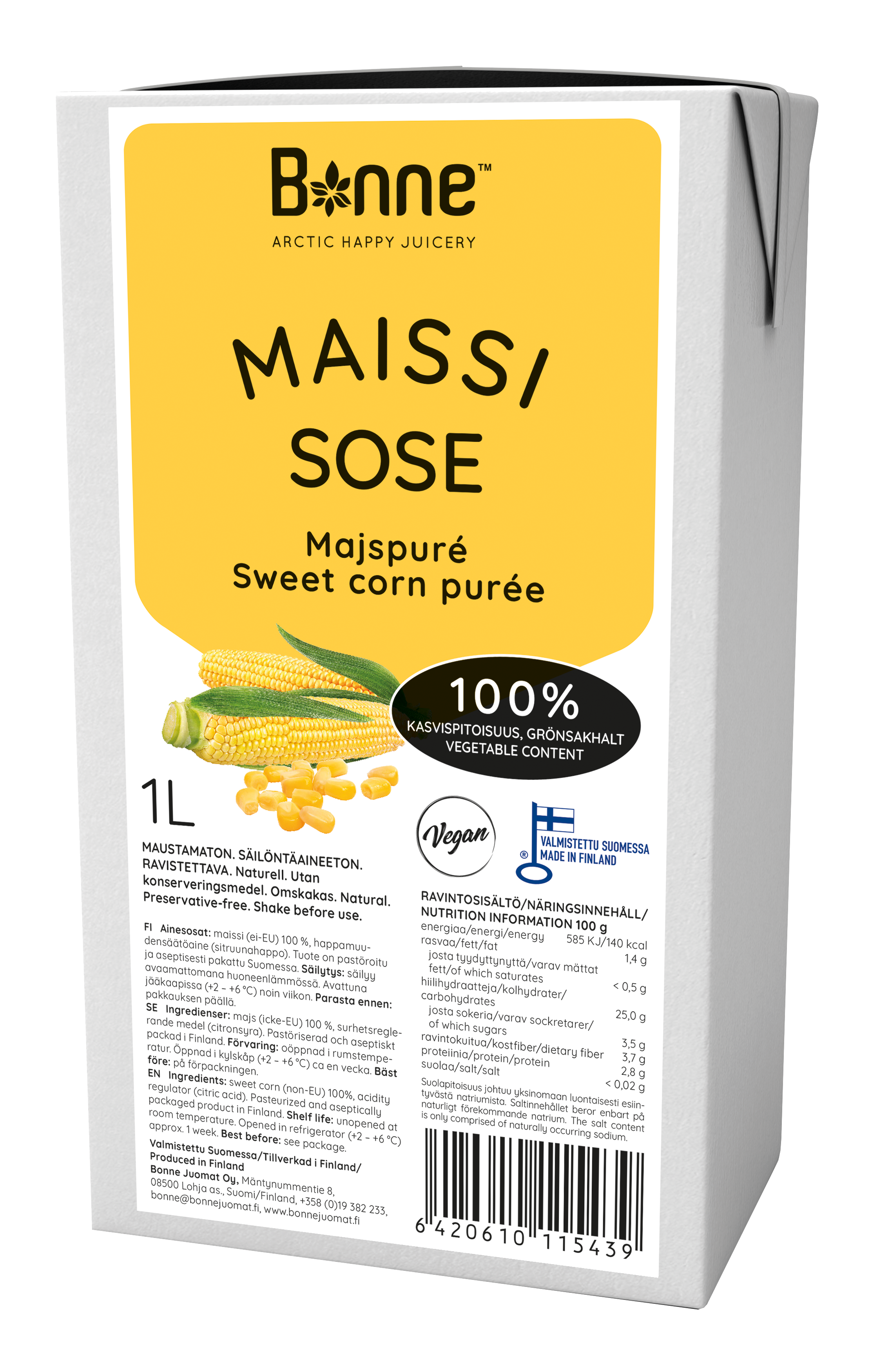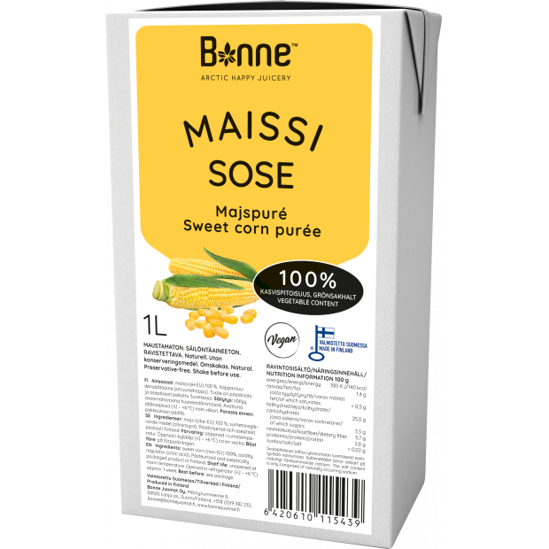 Bonne Maissgrün Püree enthält 100% pflanzliche Bestandteile. Das Produkt ist ungesüsst und frei von Konservierungsstoffen. Unser Püree wird hergestellt und in Lohja, Finnland, verpackt. Haltbarkeitsdatum Ungeöffnet bei Zimmertemperatur bis zum Mindesthaltbarkeitsdatum, geöffnet im Kühlschrank ca. 1 Woche. Das Produkt ist vegan und enthält keine Konservierungsstoffe. Ursprung: Außerhalb der EU