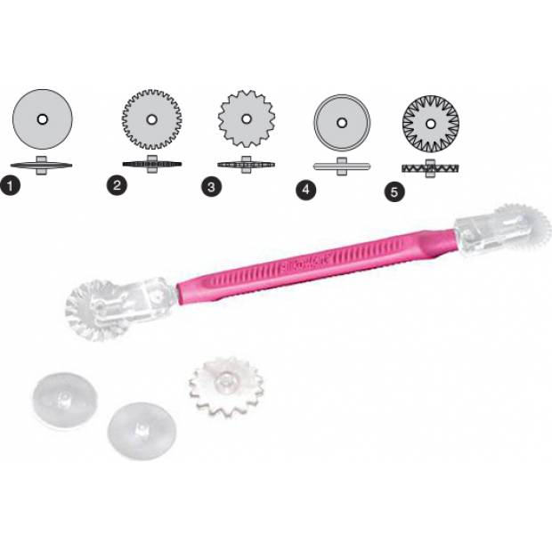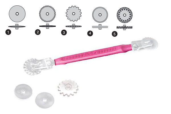 Aufsätze für die Rädelschale lassen sich schnell austauschen. Die Rädelschale ist zweiseitig. Das Set enthält zwei Typen glatter Zahnräder und drei Typen gezahnter Zahnräder.