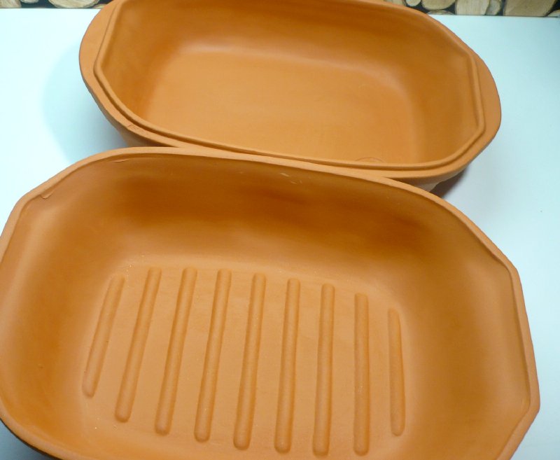 Topf besteht aus einem speziellen Material, das die Zubereitung von Speisen in Wasserdampf ermöglicht – poröse Struktur nimmt Wasser auf, das während des Backens verdampft. In diesen sogenannten römischen Tontöpfen wird kein Fett oder Öl hinzugefügt. Die Lebensmittel kleben jedoch nicht aneinander, behalten nicht nur ihr natürliches Aussehen und ihren Geschmack, sondern auch den Großteil der Vitamine und aller Nährstoffe.
