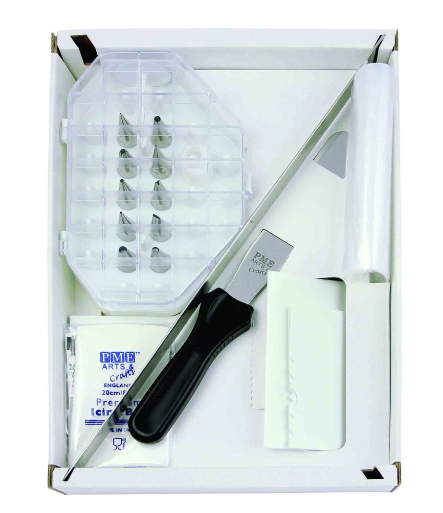 Enthalten ist: 10 Edelstahlaufsätze für Spritzbeutel mit verschiedenen Abschlüssen, 5 Einweg-Spritzbeutel, 1 Stoff-Spritzbeutel, 40 cm Lineal, großes Spachtelmesser, 4 Muster-Schaber für Creme, glatte Spachtel und eine Box für Spritzspitzen.